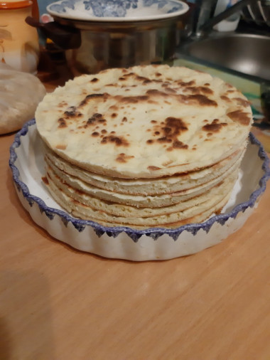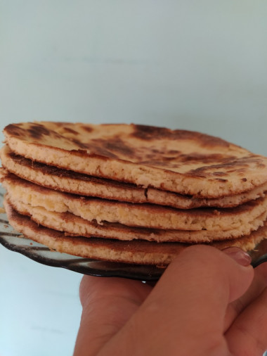 Сковороду разогрейте. Желательно брать сковороду с толстым дном, чтобы корж успевал пропечься, у меня чугунная. Выложите раскатанный корж на горячую сковороду. Кстати, если вдруг при переносе коржик слегка деформировался, то поправьте его сразу же на сковороде руками. Обжаривайте корж на небольшом огне сперва с одной стороны до румяности, при этом сверху корж должен покрыться пузырями и стать матовым (не будет следов сырого теста).