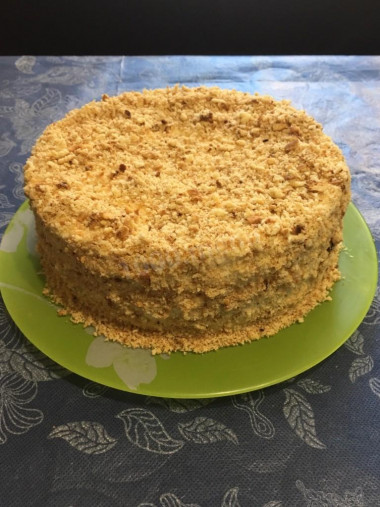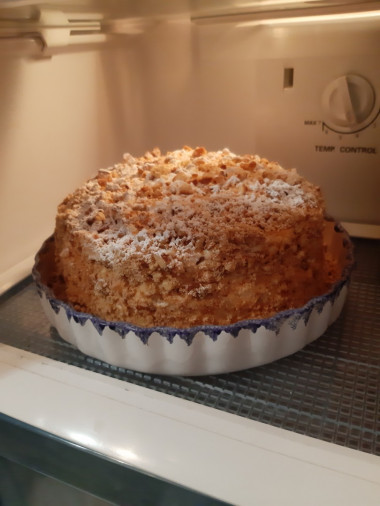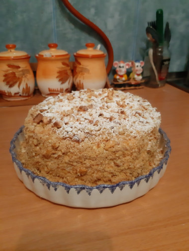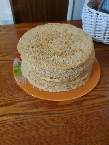 И обсыпьте ею торт со всех сторон. Отправьте медовик в холодильник на 4-5 часов (или на дольше) для пропитки.