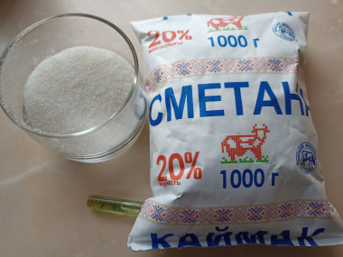 Возьмите сметану (чем большей жирности, тем лучше), выложите ее в миску и добавьте сахар и ванильный сахар. Вместо ванильного сахара можно добавить ванилин. Его нужно совсем немного, буквально на кончике ножа, так как большее количество придаст готовому блюду горечь.