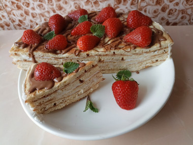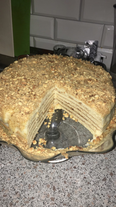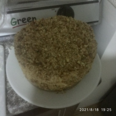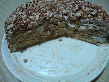 Получилось как обычно - то есть хуже чем хотелось, но лучше чем ожидалось. Крема вышло чересчур много, оставался лишний, а коржи потом были сухие, не все коржи пропеклись. Главная моя проблема была в том, что я не могла положить на сковородку тонкий и большой корж, делала маленькие и толстые. В следующий раз планирую раскатывать на силиконовом коврике специально для этого (на нем нарисованы круги) и запекать в духовке. В общем грустно, но на ошибках учатся!