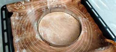 Готовый корж перенесите на ровную поверхность и сразу подрежьте его до нужных размеров (я использовала тарелку диаметром 22 см).