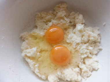 Взбить яйца с сахарно-масляной массой до однородного состояния.