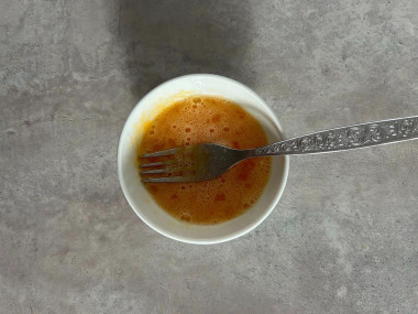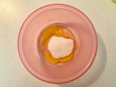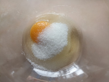 Яйцо вбейте в миску для теста, всыпьте к нему сахар. Взбейте яйцо с сахаром до объединения.