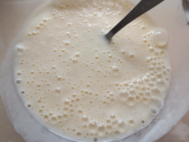 Скисшее молоко слегка подогрейте на плите или в микроволновке — это первый секрет пышных оладий. В теплом молоке реакция кислоты с содой будет быстрее. Но не перестарайтесь, чтобы молоко не превратилось в творог. Вылейте молоко к яйцу, перемешайте.