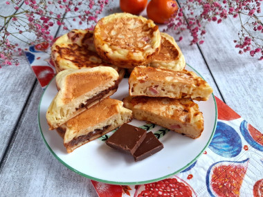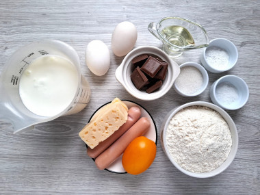 Для сладкой начинки я взяла молочный шоколад. Для солёной нарезала пару сосисок, натерла вкусный сыр и от себя добавила маленькую помидорку для сочности.