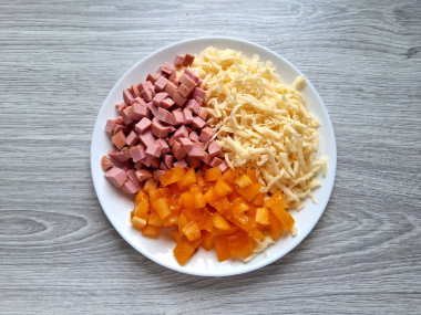 Для соленой начинки нарежьте колбасу кубиками.