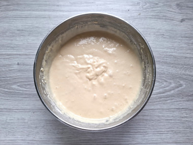 Всыпьте просеянную муку. Перемешайте до исчезновения комочков. Если тесто все еще будет жидким, то добавьте еще муки. Если густым — влейте немного кефира или теплой воды. По консистенции оно должно стать как сметана. Разделите тесто по двум мискам. О муке и её свойствах подробнее можно прочитать в отдельной статье, ссылка в конце рецепта.