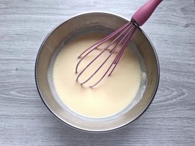 Вбейте в кефир яйца. Перемешайте жидкие ингредиенты венчиком.