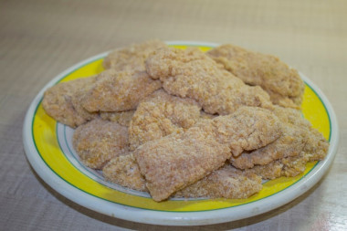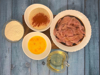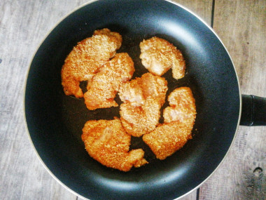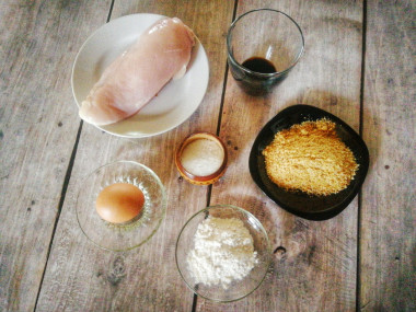 Закончив нарезку, замариновала мясо в соевом соусе на 40 минут. Соль в маринад не добавляла, посолила только немного взбитое яйцо. Обмакивала в яйцо курицу, затем помещала ее в муку, снова обмакивала в яйцо и, наконец, обваливала в панировочных сухарях. Обжаривала до румяной корочки. Долго мясо на сковороде не держала, чтобы не пересушить его.