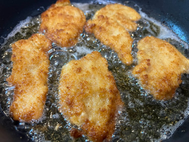 Растительное масло я хорошо разогрела и жарила наггетсы до золотистой корочки.