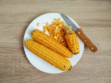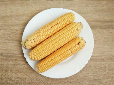 Сначала подготовьте кукурузу. Берите свежие початки, без признаков порчи. Приготовьте кукурузу удобным вам способом. Если варите в кастрюле, воду не солите, чтобы зерна остались мягкими. Я сварила початки в микроволновке. Для этого кукурузу мыть нет необходимости, достаточно протереть ее снаружи влажной тряпочкой. Нужно убрать только внешние сухие листья с початков.