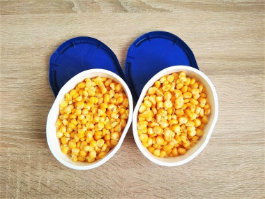 Разложите зерна в пакеты для заморозки или в контейнеры и уберите в морозильную камеру. У меня с 3 початков получилось 600 г зерен. В будущем зернышки кукурузы можно добавлять при приготовлении различных блюд (без предварительного размораживания).