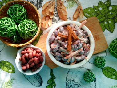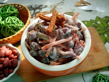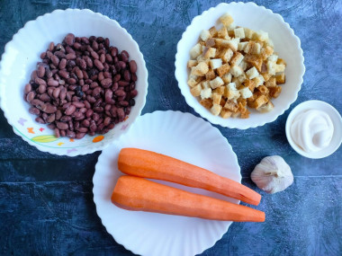 Как сделать салат из отварной красной фасоли и моркови? Подготовьте все необходимые ингредиенты. Чтобы салат был полезнее и вкуснее, лучше всего использовать для заправки домашний майонез собственного производства. Сухарики можно взять готовые или приготовить самостоятельно.