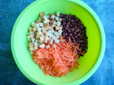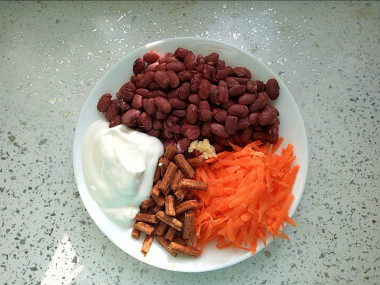 В глубокой миске (сплетнице) соедините отваренную красную фасоль, натёртую свежую морковь и сухарики из белого хлеба (у меня со вкусом чеснока).
