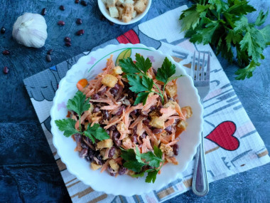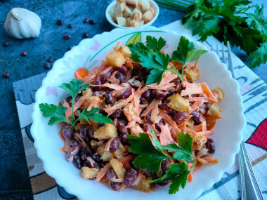 Приготовила по вашему рецепту салат из отварной красной фасоли и моркови. Фасоль замачивала на ночь, утром её отварила, по времени ушло 35 минут. Морковь натёрла на крупной тёрке. Сухарики приготовила сама из старого белого хлеба. Из специй добавила чёрный и красный молотый перец. Чеснока добавила 3 некрупных зубка. Получился очень вкусный и сытный, пикантный салатик! Всей семье понравился!