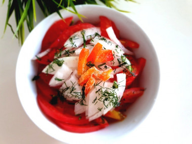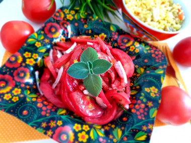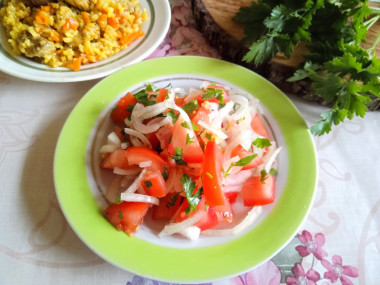 Приготовила салат к плову из помидор и лука по этому рецепту. Очень простой рецепт салата из доступных продуктов. Несколько минут и вкуснятина готова. Использовала домашние овощи с грядки. Нарезала всё произвольно. Из зелени добавила свежую зелень петрушки. Острого перца положила совсем немного. Помидорный салат у меня настаивался не долго. Великолепный салат, он прекрасно дополняет плов. Блюдо красивое, сочное и вкусное. Всем очень понравился яркий и пикантный салатик. Большое спасибо автору!