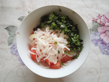 Лук очистите от шелухи, ополосните и нарежьте тонкими перьями или полукольцами. Добавьте к помидорам.