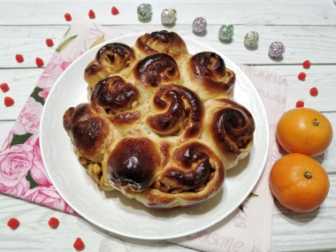 Пирог на кислом молоке в духовке сразу заинтересовал меня, как только увидела его на этом сайте. Готовить его - одно эстетическое удовольствие. Оригинальная начинка из яблок потрясще сочетается с дрожжевым тестом! Особенно он хорош, когда остынет. Мы съели его в один миг, настолько он понравился. Форма у меня 24 см, розочек вышло всего 10 штук, на всю форму не хватило, поэтому они немного расползлись в процессе выпекания. Двум булочкам не досталось яблок, но они у меня изначально были небольшие, поэтому, надо брать яблоки побольше. Пирог у меня сильно зарумянился, но мы так любим, поэтому специально в духовке подольше подержала. Яблоки в пироге очень нежные получились. Вкус у них великолепный, карамель, корица и яблоки - это гармония. Красивый, изящный, ароматный пирог получился - любовь с первого взгляда.
