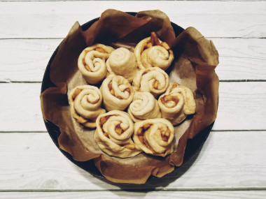 Дно форму для выпечки застелите пергаментом, бока смажьте растительным маслом. Диаметр моей формы 23 см. Советы по выбору формы для вас в статье после рецепта. Выложите крупные сформированные заготовки по краю формы на небольшом расстоянии друг от друга. "Розочки" меньшего размера поместите в середину.