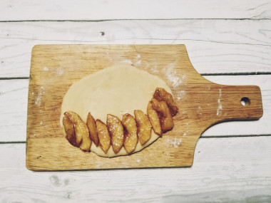 На одну сторону теста ближе к краю выложите яблочную начинку равномерным слоем.