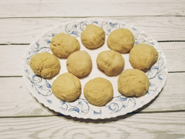 Аккуратно обомните тесто, выложите на стол, припудренный мукой. Разделите тесто на части. Я разделила на 11 частей, 3 из которых сделала немного меньшего размера.