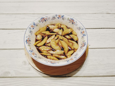 Яблоки помойте, обсушите. Очистите фрукты от кожицы и семян и нарежьте не очень тонкими ломтиками. Чтобы яблоки не так быстро темнели, можно сбрызнуть их лимонным соком.