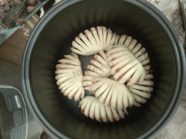 Картофель моем, чистим и режем на кружочки одинаковой толщины (примерно полсантиметра или чуть толще). Складываем кружочки стоя друг за другом в чашу мультиварки.