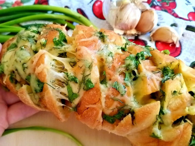 Готовый батон посыпьте отложенной нарезанной зеленью и подавайте к столу горячим. Приятного аппетита!