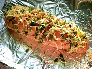 Через 20 минут приоткройте фольгу и оставьте батон в духовке еще на 5-7 минут для того, чтобы он подрумянился сверху. Нужно, чтобы хлеб подрумянился сверху.