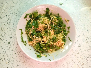 Зелень промойте, обсушите и мелко нарежьте. Немного зелени отложите для украшения.