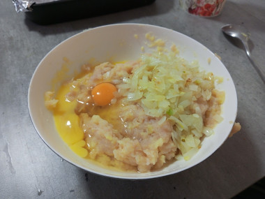 Соедините картофельное пюре, обжаренный репчатый лук, укроп, яйцо, куриный фарш, соль. Все хорошо перемешайте. Обязательно мойте яйца перед использованием, так как даже на кажущейся чистой скорлупе могут находиться вредные бактерии. Лучше всего использовать моющие средства для пищевых продуктов и щетку.