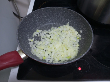 Обжарьте лук на растительном масле до прозрачности. Чтобы лук не сгорел при жарке, сделайте огонь небольшим и помешивайте его.