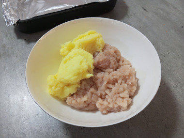 Как сделать картофельные котлеты с фаршем и сыром? Подготовьте продукты. Фарш вы можете взять как готовый, магазинный, так и сделанный самостоятельно. Кроме того, он может быть не только из курицы — подойдет и говяжий, и свиной. Учитывайте только, что при этом изменится и калорийность блюда.