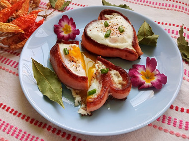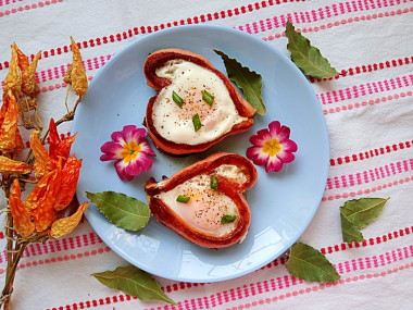 Вбиваем в каждое сердечко яйцо - видно, что белок немного вытек наружу, но это не страшно, вед в конце приготовления его легко обрезать ножом