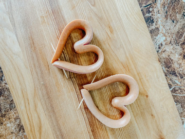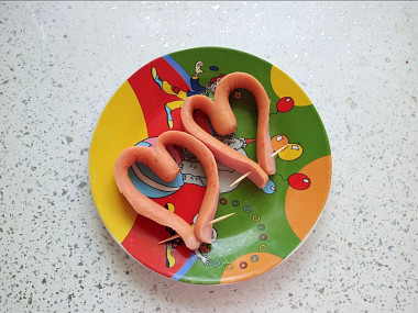 Края сосиски выворачиваем наружу и скрепляем зубочисткой. Если сосиски предварительно не отварить, она с большой вероятностью у вас разорвется пополам