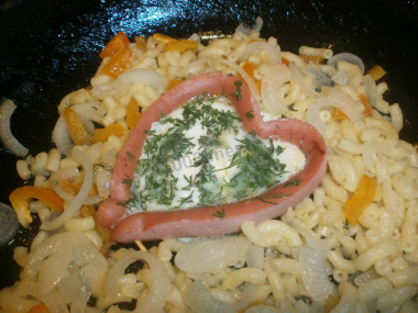 А я еще и по ужинать успела.....(фото со сковороды),жаль только,что сосиска была "венская"(тоненькая).