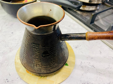 В джезву всыпьте молотый кофе, влейте оставшиеся 90 мл воды и перемешайте. Поставьте на медленный огонь и доведите до кипения. Когда кофе закипит процедите его через мелкое ситечко, верните на огонь и снова доведите до кипения.
