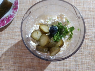 Поэтому для лучшего взбивания добавила пару ложек кефира. Взбила в блендере. Следом пошли полтора солёных огурца, петрушку. И последним штрихом было масло, количество которого я уменьшила.