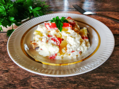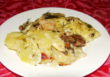 Картошку я, правда, сначала сварила, так как она жестковатая, плохо разваривается. В готовом виде она вышла очень аппетитная и мягкая. Мясо - с хрустящей корочкой, сыр - воздушный, нежный, похожий на белую шапочку. Очень вкусно!