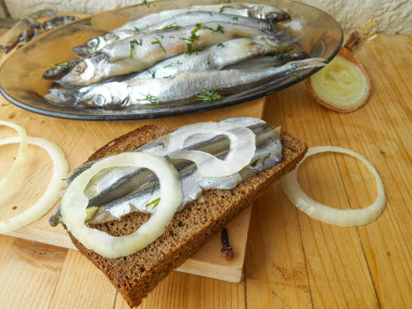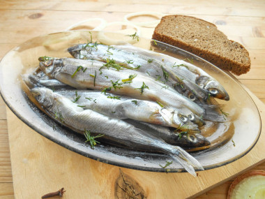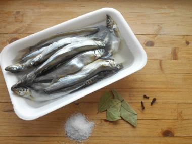 Как засолить мойву пряного посола в домашних условиях? Приготовьте все необходимые ингредиенты. Отнеситесь ответственно к выбору мойвы: она должна быть светлой с чёрными и не мутными глазами. Такая мойва вряд ли подвергалась двойной заморозки, а значит в готовом виде она будет плотной, жирной и ароматной. Промойте рыбу под проточной водой и выложите на бумажное полотенце или разделочную доску.