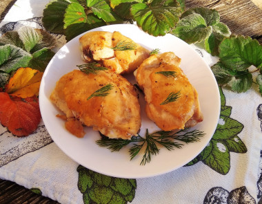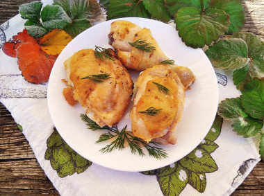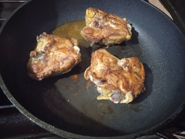 Затем бёдра переверните на другую сторону и обжарьте мясо ещё 12 - 15 минут под крышкой с другой стороны.