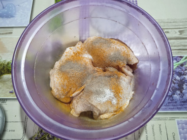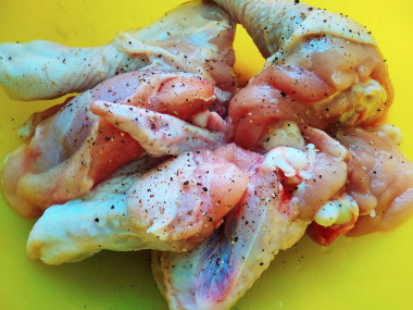 Смешайте в отдельной посуде сухие специи, соль и чёрный молотый перец и натрите этой смесью бёдрышки со всех сторон. Курицу выложите в глубокую посуду и оставьте пропитаться солью и специями от 15 - 60 минут на столе (сколько позволяет время).