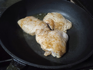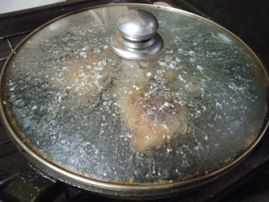 Затем нагрев убавьте до среднего - чуть ниже среднего, сковороду прикройте крышкой и обжаривайте курицу сначала 12 - 15 минут с одной стороны.