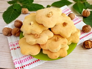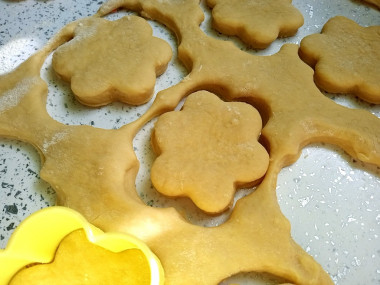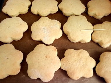 Советую для замеса теста сразу брать большую миску, теста получается много, да и муку просеивать удобнее. Кстати муки у нас ушло на стакан больше, использовали первый сорт. Сначала замешивали миксером, затем ложкой и в конце руками. Тесто получилось податливым, легко раскатывалось и не липло. Изделия вырезали вырубкой в виде цветочка, толщина заготовок примерно 1 см. Выпекали при 180°С 30 минут первый противень и 25 минут второй. Готовность определили по цвету и проткнув середину зубочисткой.