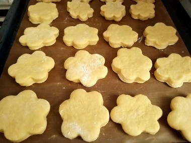 8. Нагреваем духовку до 200 градусов, противень посыпаем мукой и выкладываем на него будущие коржики. Выпекаем их в духовке примерно 15 минут.
