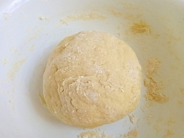 5. Муку просеиваем, постепенно вмешиваем в содержимое миски. Тесто должно получиться не слишком крутым, довольно мягким и эластичным.