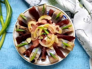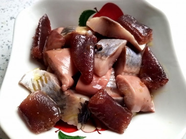 Нашла рецепт селедочка под водочку и не смогла пройти мимо. Тем более у меня была селедка домашнего посола. Замариновала кусочки по этому рецепту, муж остался очень доволен. Кроме самой селедки мариновала молоки и икру. Лук отдельно залила яблочным уксусом, ароматным горчичным маслом и добавила свежемолотый перец. После этого залила маринадом селедку и оставила немного пропитаться. Селедочку с икрой и молоками разложила на тарелочку, сверху лук и остатки вкуснейшего маринада. Это крутая закуска! Селедочка такая пряная, сочная, ароматная! Любое застолье украсит эта замечательная закуска.