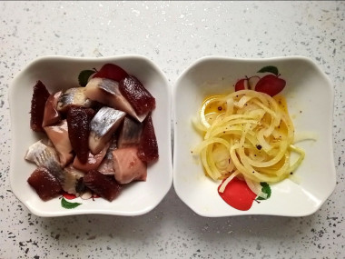 Первым делом нарезать лук тонкими кольцами или полукольцами - как вам удобнее. Выложить лук в небольшую посуду, залить уксусом и маслом, добавить специи. Аккуратно, чтобы не повредить лук, перемешать. Дать несколько минут замариноваться.