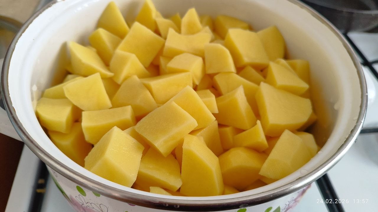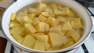 Картофель очистите от кожуры и хорошо промойте от загрязнений. Крупные клубни разрежьте на 2-3 части. Мелкие можно оставить не разрезая. Подготовленный картофель выложите в кастрюлю для варки и залейте водой так, чтобы он весь был под водой. Поставьте на огонь и доведите до кипения. Добавьте соль.Затем сделайте огонь немного меньше и варите картофель до готовности. На это уйдет минут 15-20. Проткните картофель ножом. Если картофель мягкий, то он уже готов.Шаг 3: