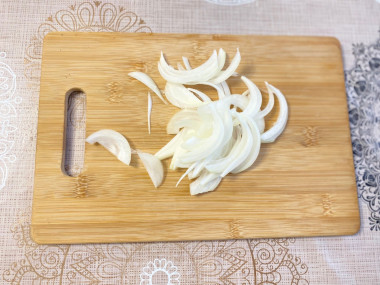 В рецепте заменила томатную пасту на сок, все остальное делала по рецепту. Обычно для тушения мяса лук режу мелко, потому что есть привереда, который вечно выбирает лук, но здесь нарезала крупно перьями.